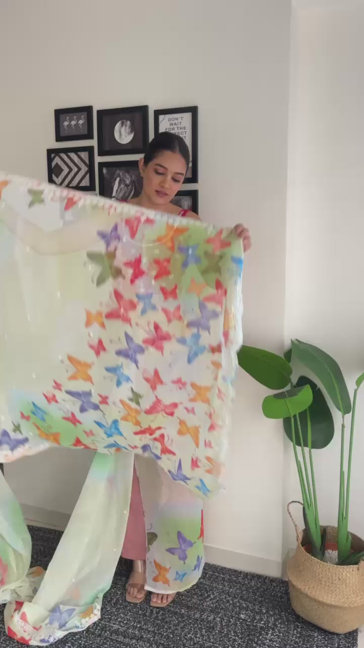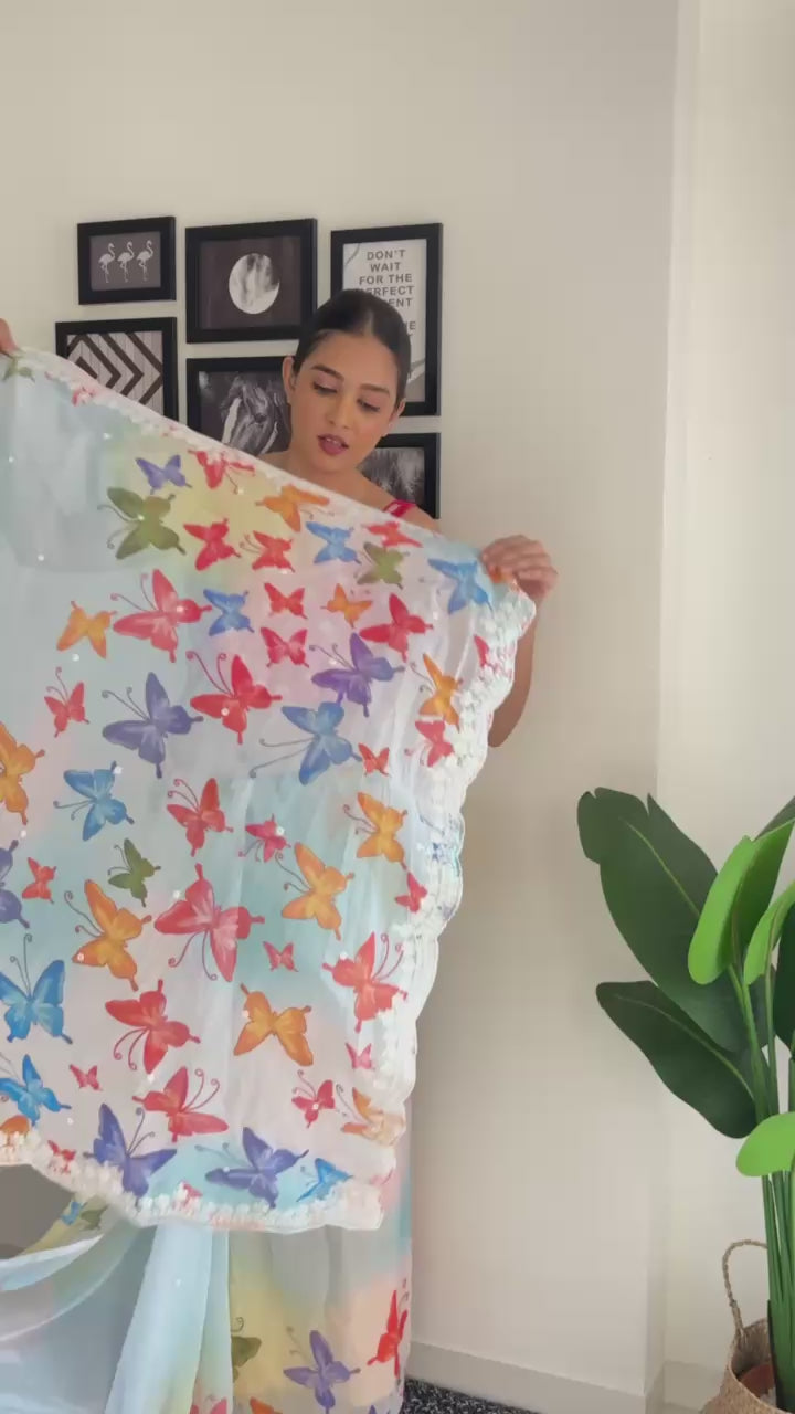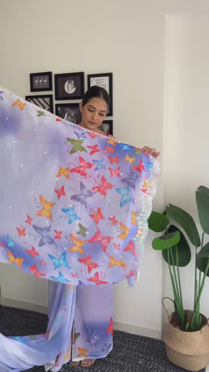 Elevate your ethnic look with our Embellished Embroidered Saree. Made of Georgette fabric with digital print, it features 5 MM sequence work, coding work, and sequence lace cut border for an elegant touch. The diamond silk blouse with both side work completes the ensemble. Length of 5.50 Mtr for saree and 0.80 Mtr for blouse.