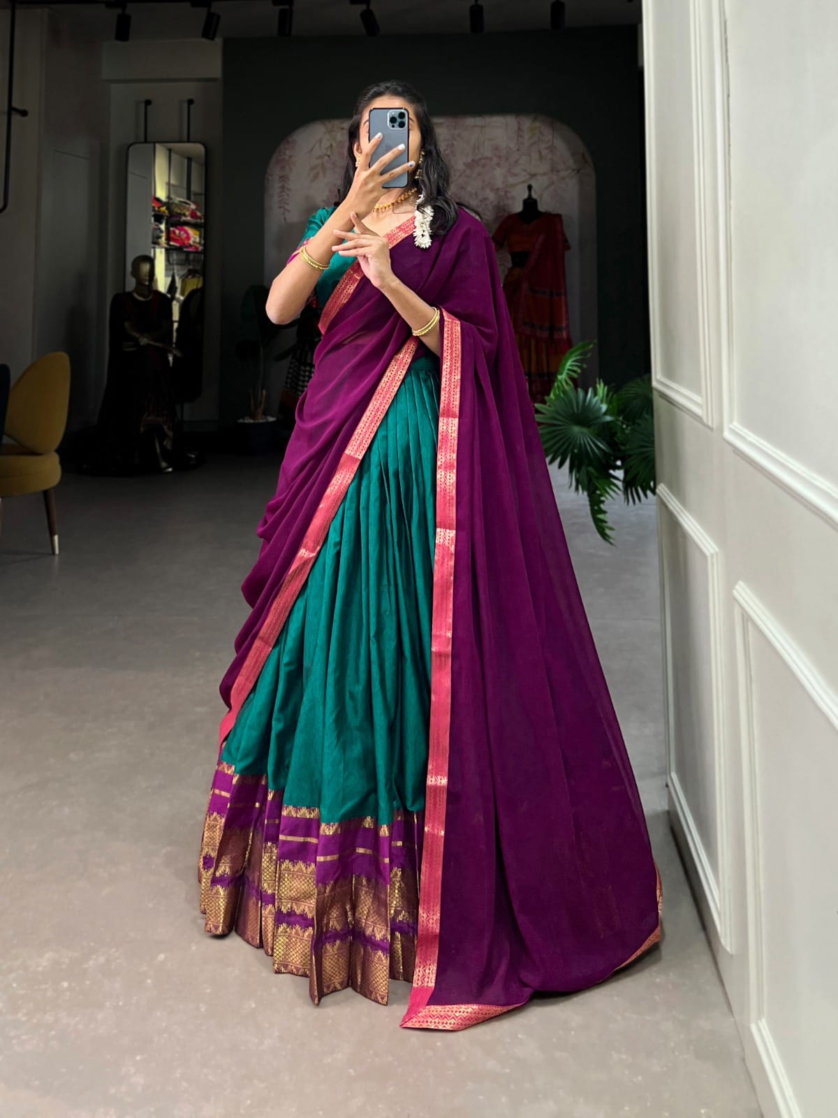 Immerse Yourself in Tradition with Our South Style Poly Cotton Half Saree, Paired with an Elegant Georgette Dupatta🍁