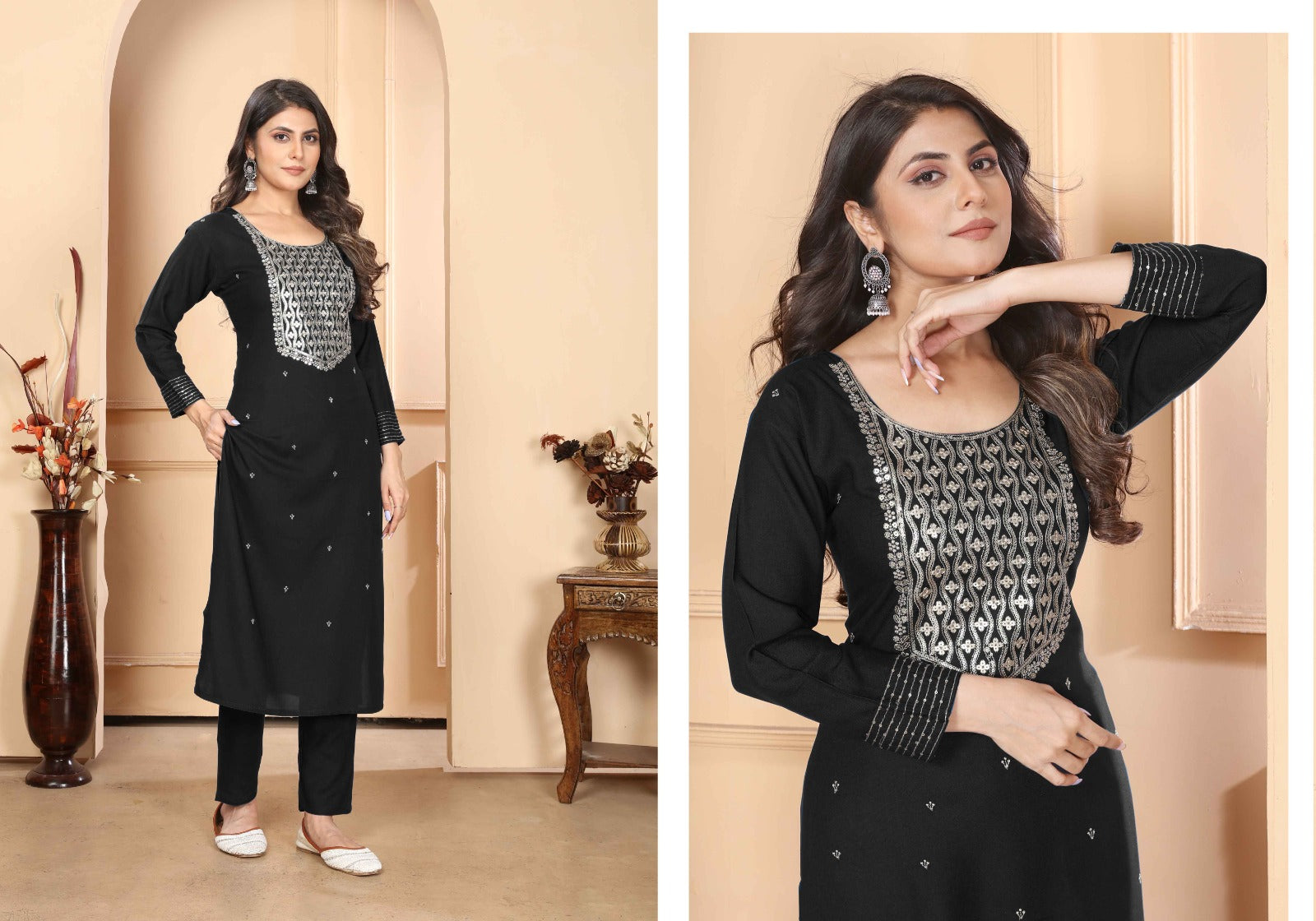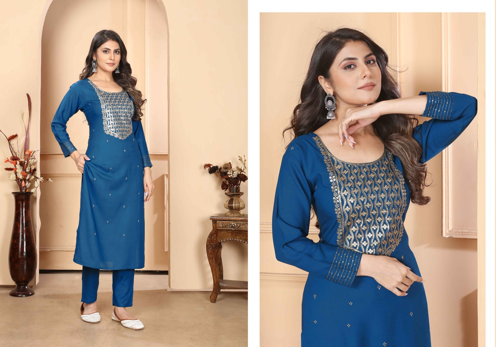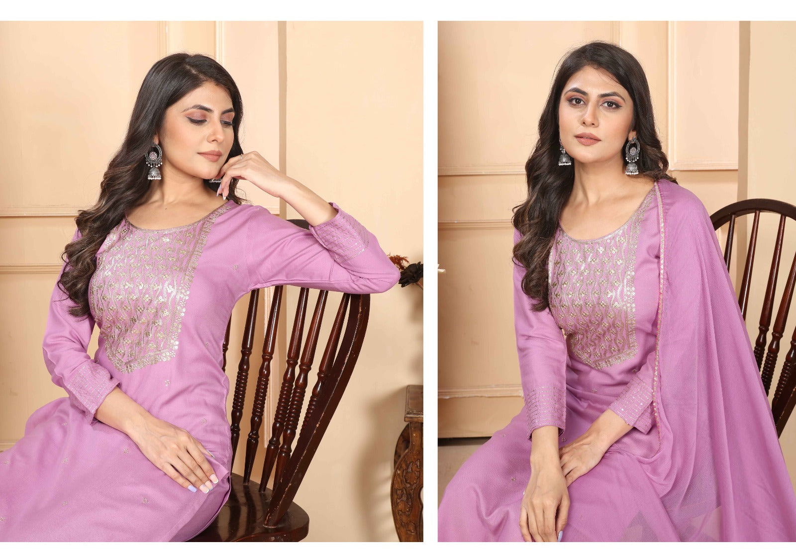 Introducing our *Rashmi Vol-1️⃣ Salwar Suit* with stylish sequin embroidery on premium Rayon fabric. Featuring three-quarter sleeves and a printed pattern. Available in single combo and a range of sizes (S-XXXL). The top is complemented by 2-pocketed pants and a heavy Najmin dupatta with four side lace detailing, in a choice of 5️⃣ colors. Elevate your ethnic wardrobe with this elegant and comfortable ensemble.